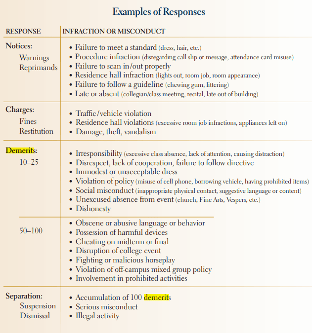 The Demerit system was the way the college would discipline their students. Minor rules that were broken were allotted a single warning. After that point you had to attend “student court” and receive your demerits. Yes, you had to walk up to a group of old men and apologize and receive your punishment. You couldn’t skip this aspect of the disciple system or “student life” would increase the number of demerits received.