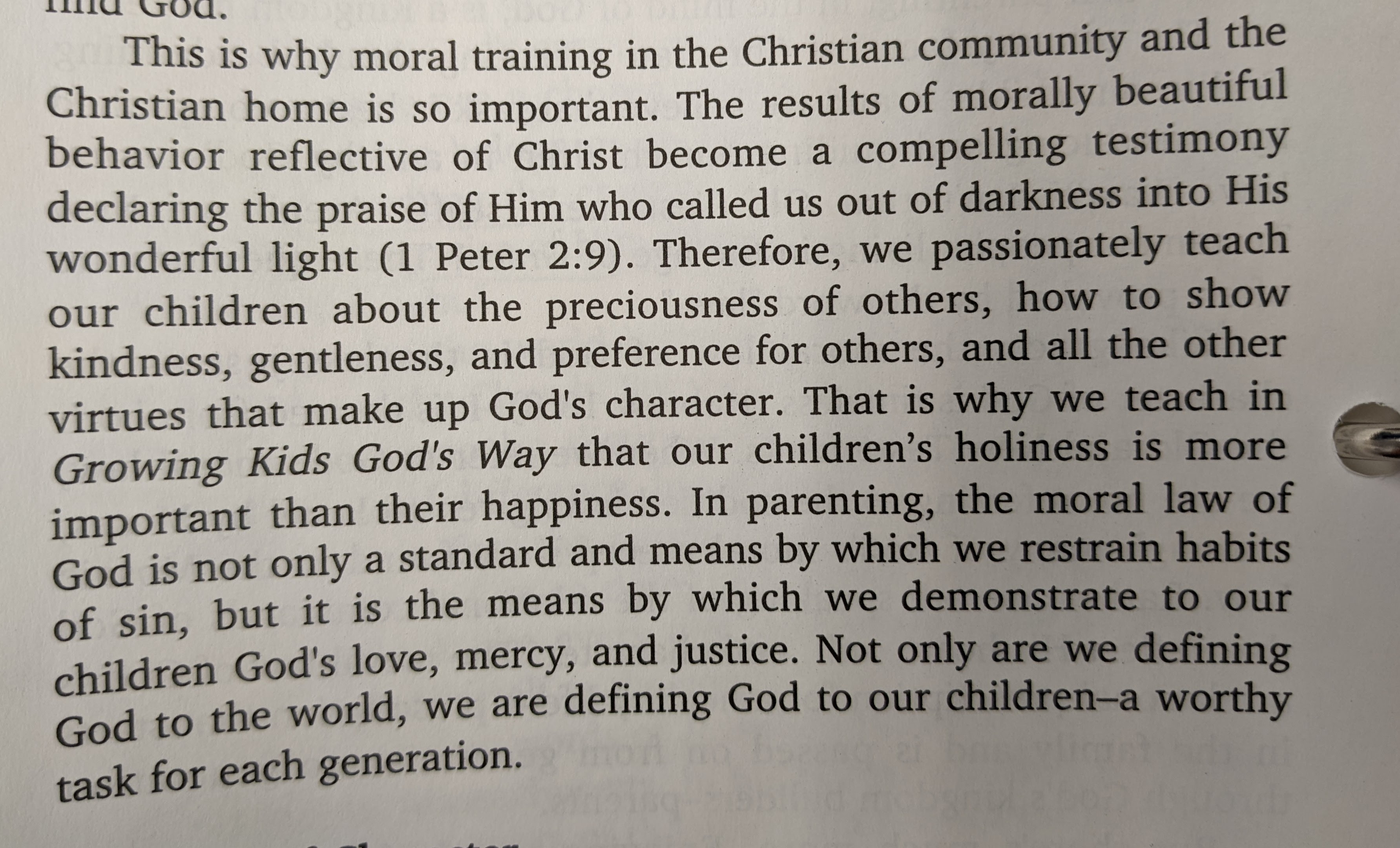 It’s a long portion of text. But I felt the whole portion needed to be included to follow his train of thought. Gary states that this training is so very important because of the need to witness to others. And the part that jumps out to me is that this holiness / witness to others is much more important than the child’s happiness. This is the second time I’ve noticed this logic displayed in the book.