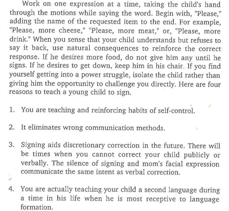 The age of the child is then discussed as it relates to whining. Gary Ezzo states that a young infant can’t understand or communicate with words. So whining is used as an alternative. However, Gary has a solution. He suggests teaching your children sign language.