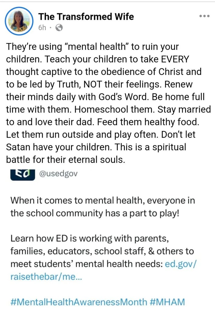 My family was going through a lot as a direct result of the teaching and beliefs that they had been taught and the faith communities that they were a part of. My mother’s health both physically and mentally suffered because of the beliefs she held. I honestly didn’t even touch on my mother’s physical health, but she suffered multiple miscarriages throughout this period of my life. She was told by multiple doctors that she should have her uterus removed for health reasons, and violently fought against that idea. She was unwilling to surrender her reproductive organs even if she had cancer.29 Something I attribute to the quiverfull theology she had been taught. Even though her body was incapable of producing children she refused to let go of the idea that god could still potentially work a miracle and grant her another child. If she removed her reproductive organs, she would be lacking faith or trust in the divine.30