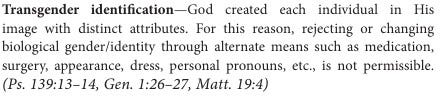 The college also goes out of their way to address gender specifically within the code of conduct. (This is a new change as they used to just include it broadly in “homosexual behavior.”)