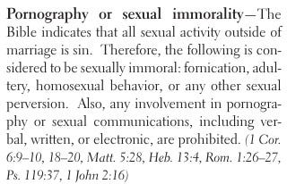 We believe that God designed the marriage union of life and have provided for intimate sexual relations exclusively between husband and wife within the bonds of marriage; sexual relations outside the bonds of marriage, including fornication, adultery, incest, sodomy, bestiality, among others alluded to in God’s Word, are a sin. We believe acts that defile God’s human creation, such as gender modification, through medical procedures or by appearance, and participation in the sexual degradation of others through pornography, are attacks against the family unit, are against the will of God, and are sins (Genesis 2:24; 19:5, 13; Leviticus 18:1-30; Romans 1:18-32; I Corinthians 6:6-10; 7:3-5; Hebrews 13:4; Ephesians 5:3-5; I Thessalonians 4:8).