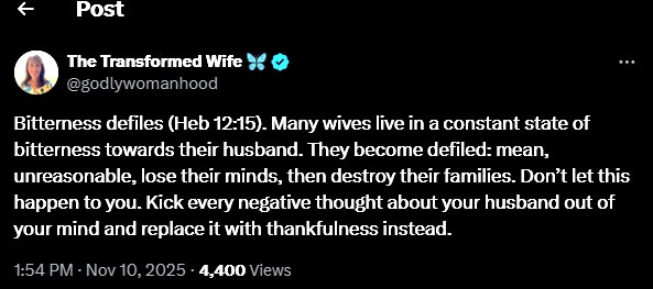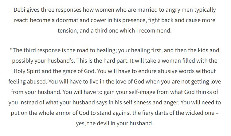 My mom lived this shit and let me tell you it doesn’t work. The abuser never changes, and the submissive partner can only bottle it up so long before it eventually spills out. And when that outburst does happen, the abuser can point to the victim as the one being “sinful.”