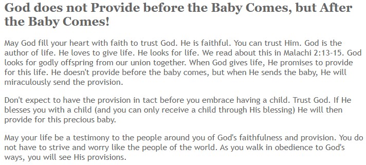 Pronatalism or quiverfull ideas place a lot of pressure and emphasis on having children. It’s the after part that isn’t exactly thought out well. Within many quiverfull circles, any outside pushback on making sure kids have the emotional, physical, and financial support they need is considered to be temptations from the “the devil.” “The devil” is just trying to get you to “give into fear.” God himself will give you everything you need to care for your children. You just need to trust him.